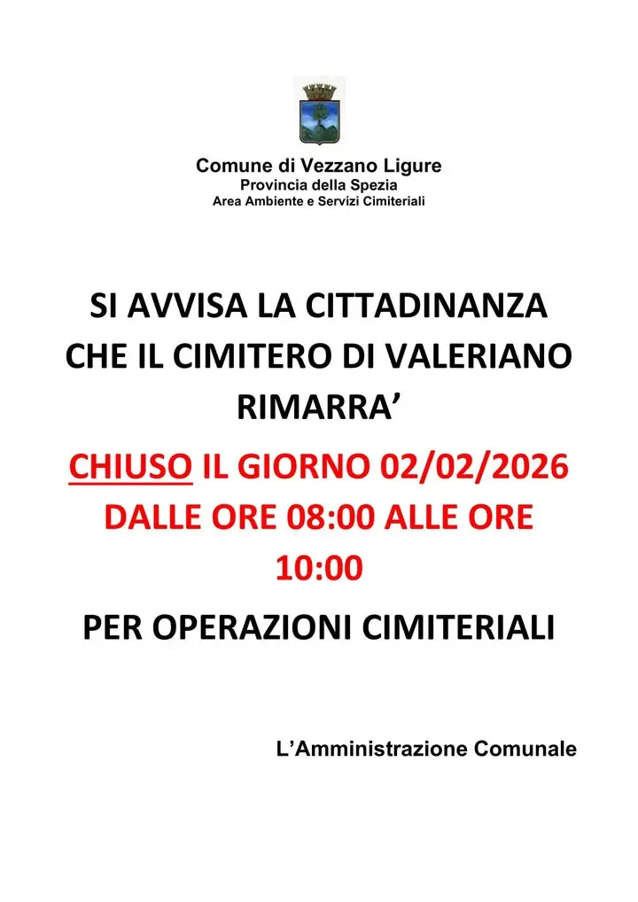 AVVISO CHIUSURA CIMITERO DI VALERIANO